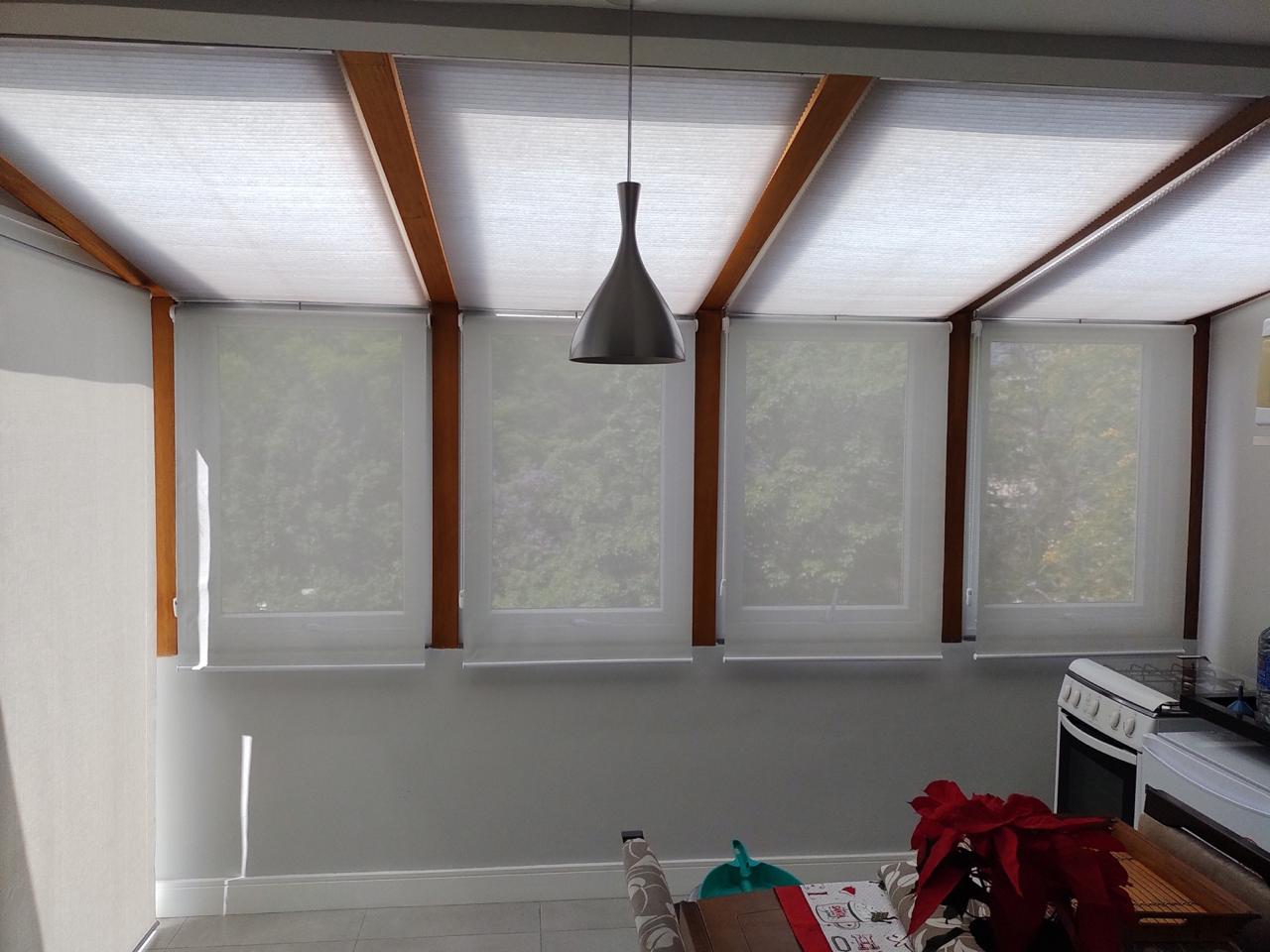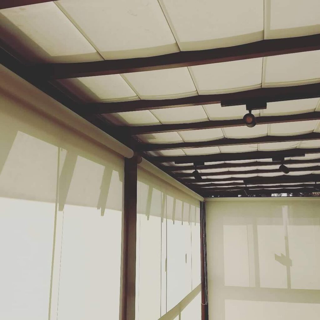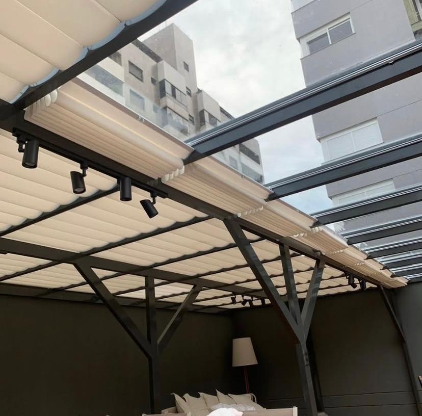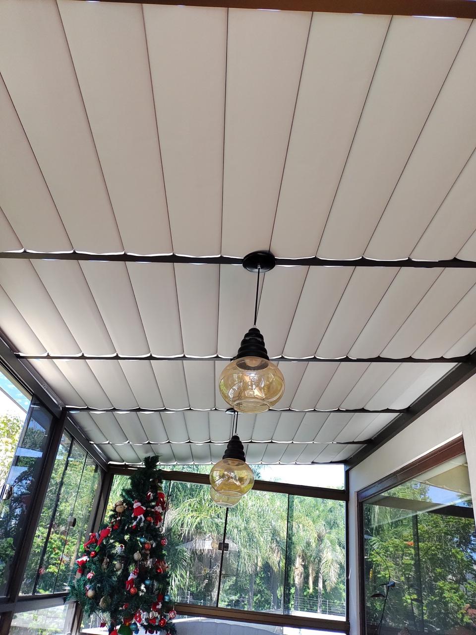A Cortina Romana de Teto é uma solução para o aproveitamento de áreas externas cobertas por vidros ou policarbonato. Reduz a intensidade da luz e bloqueia os raios UV. Ideal quando confeccionada